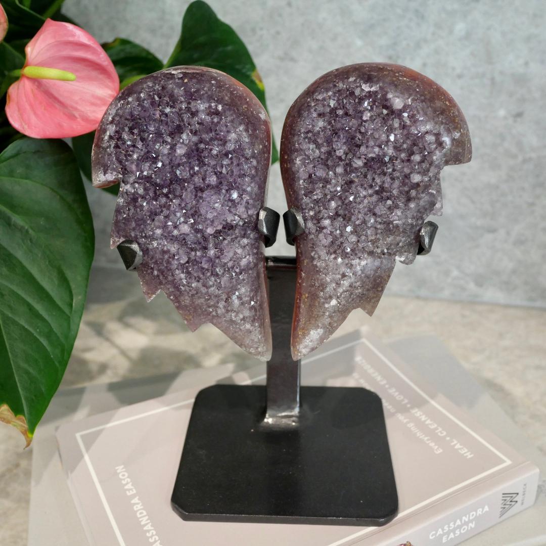 What a Stunning show piece! These beautiful hand carved and polished Angel Wings come complete with a metal stand for displaying. Wings can be removed from the stand, they are not permanently fixed to the stand. The quality & Craftsmanship is amazing. They are direct from Brazil, where the best Amethyst is sourced from.