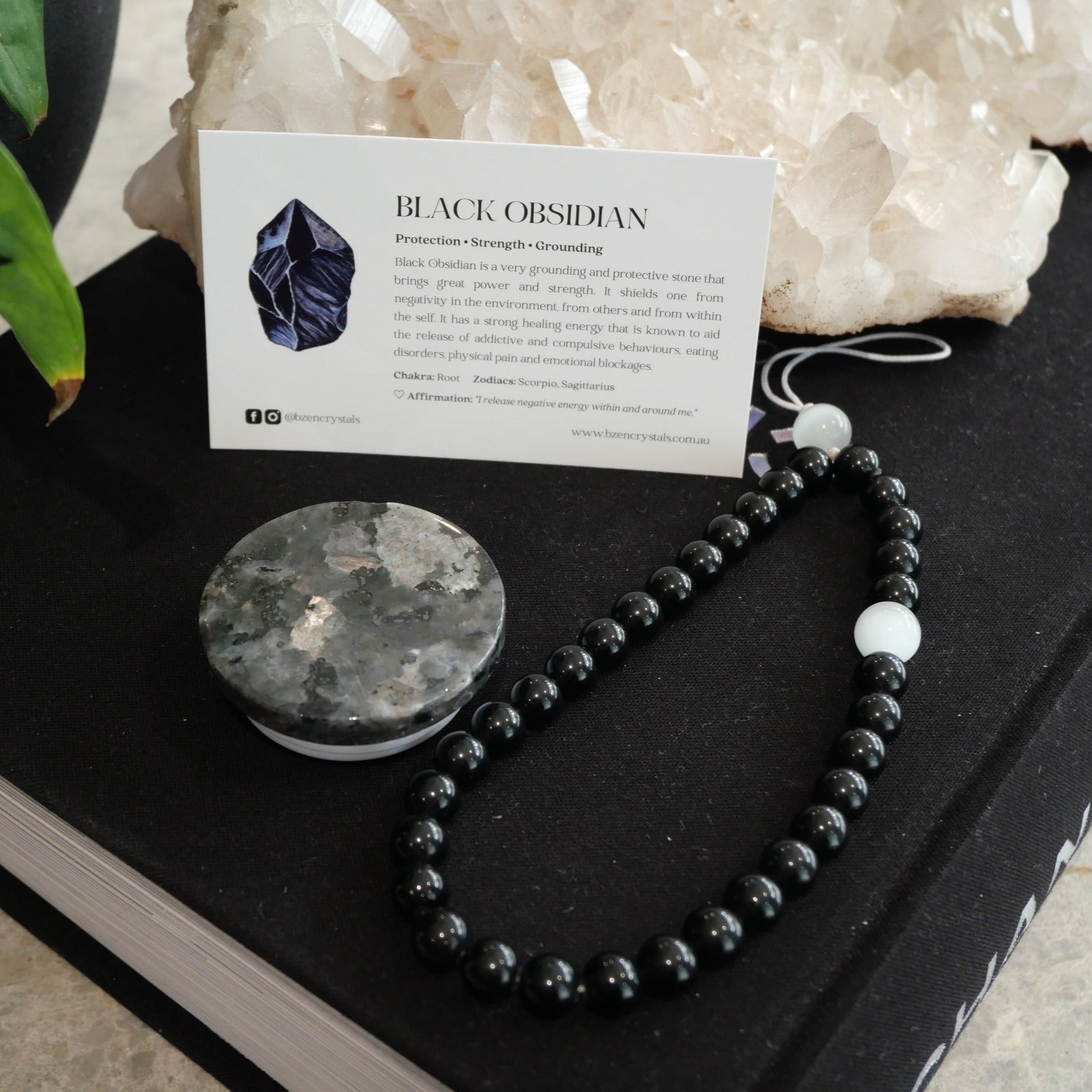 Larvikite Pop Socket & Obsidian Phone Strap Bundle Set