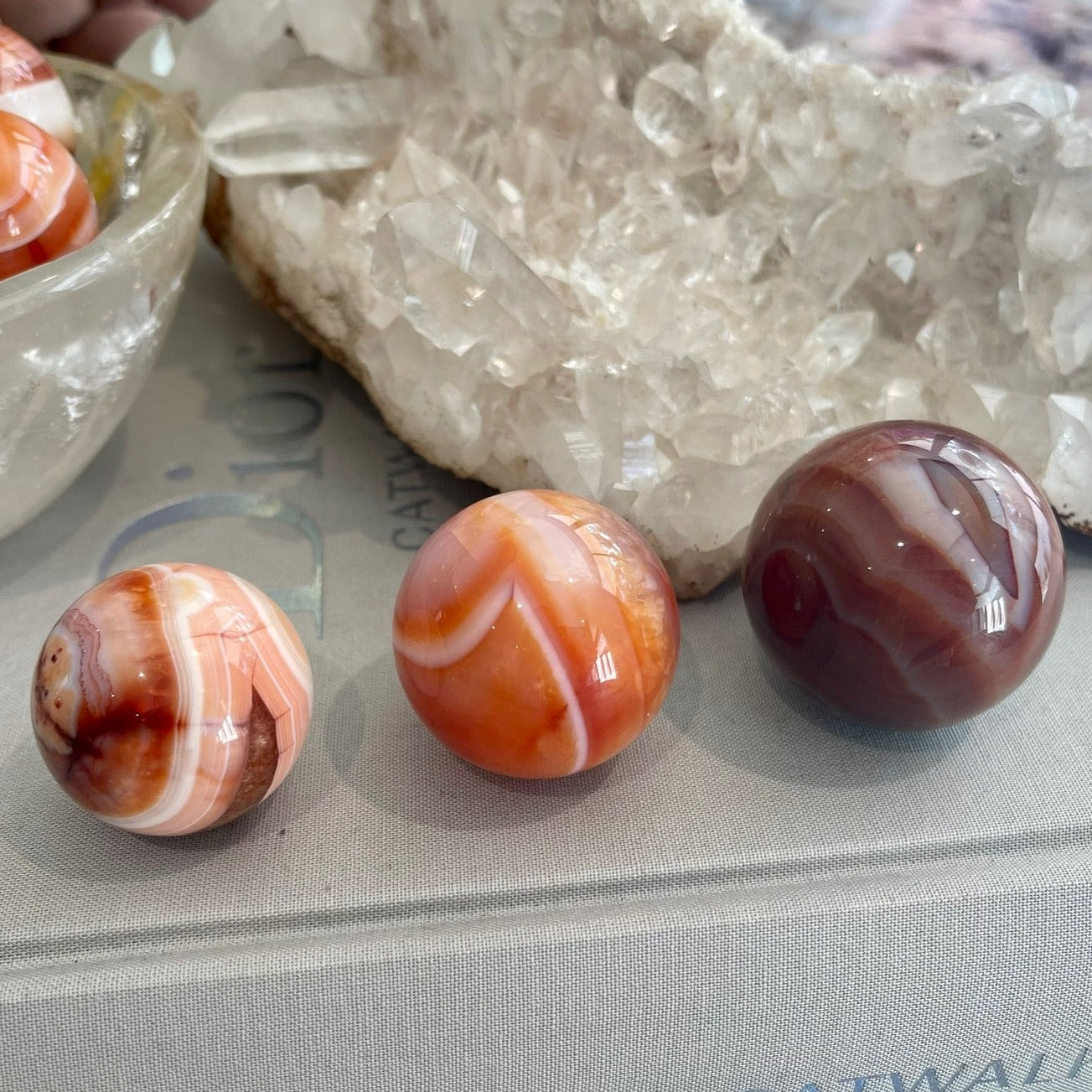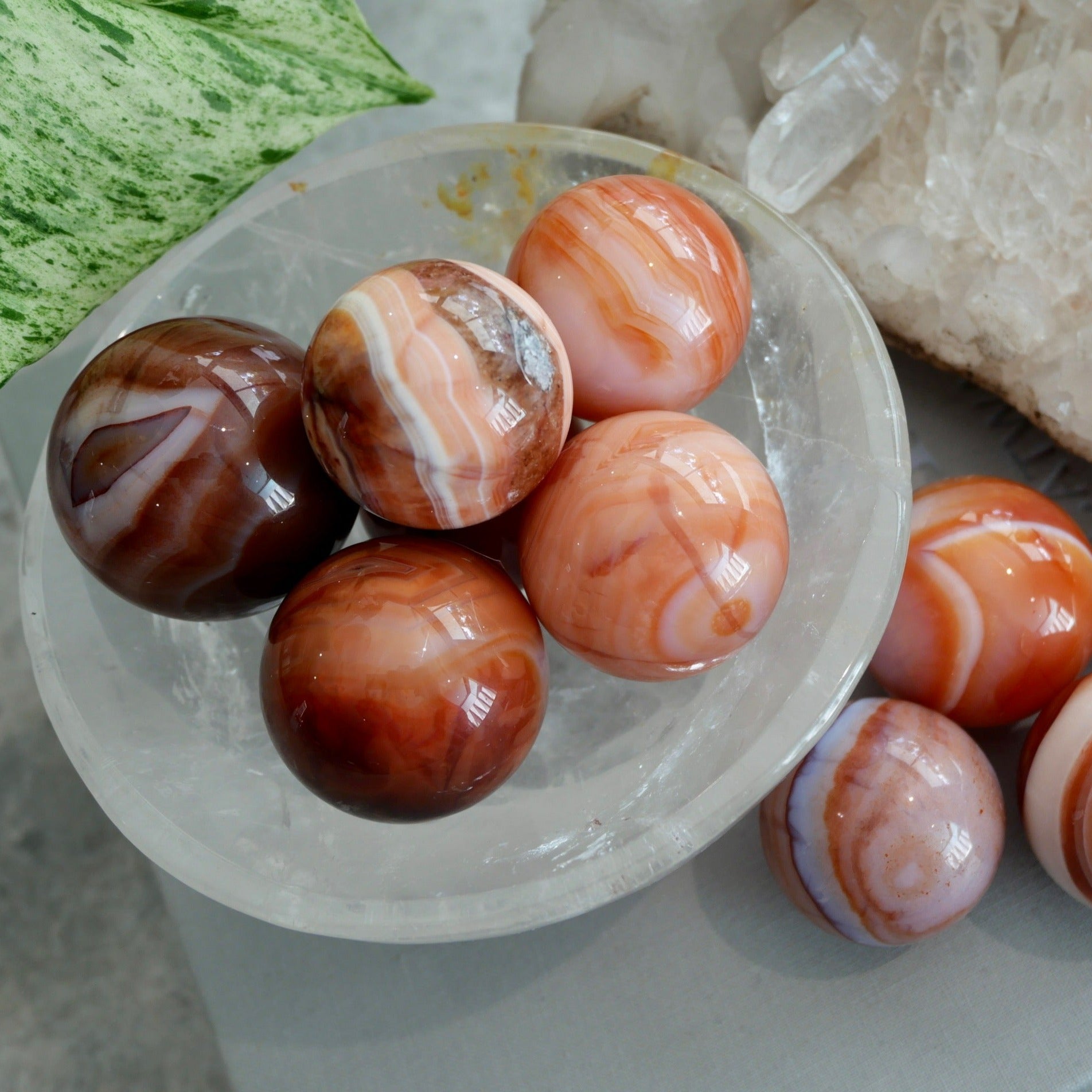 These gorgeous High Quality Carnelian Spheres have the most amazing banding. They would look gorgeous styled in a crystal bowl in your home or on your bedside table.