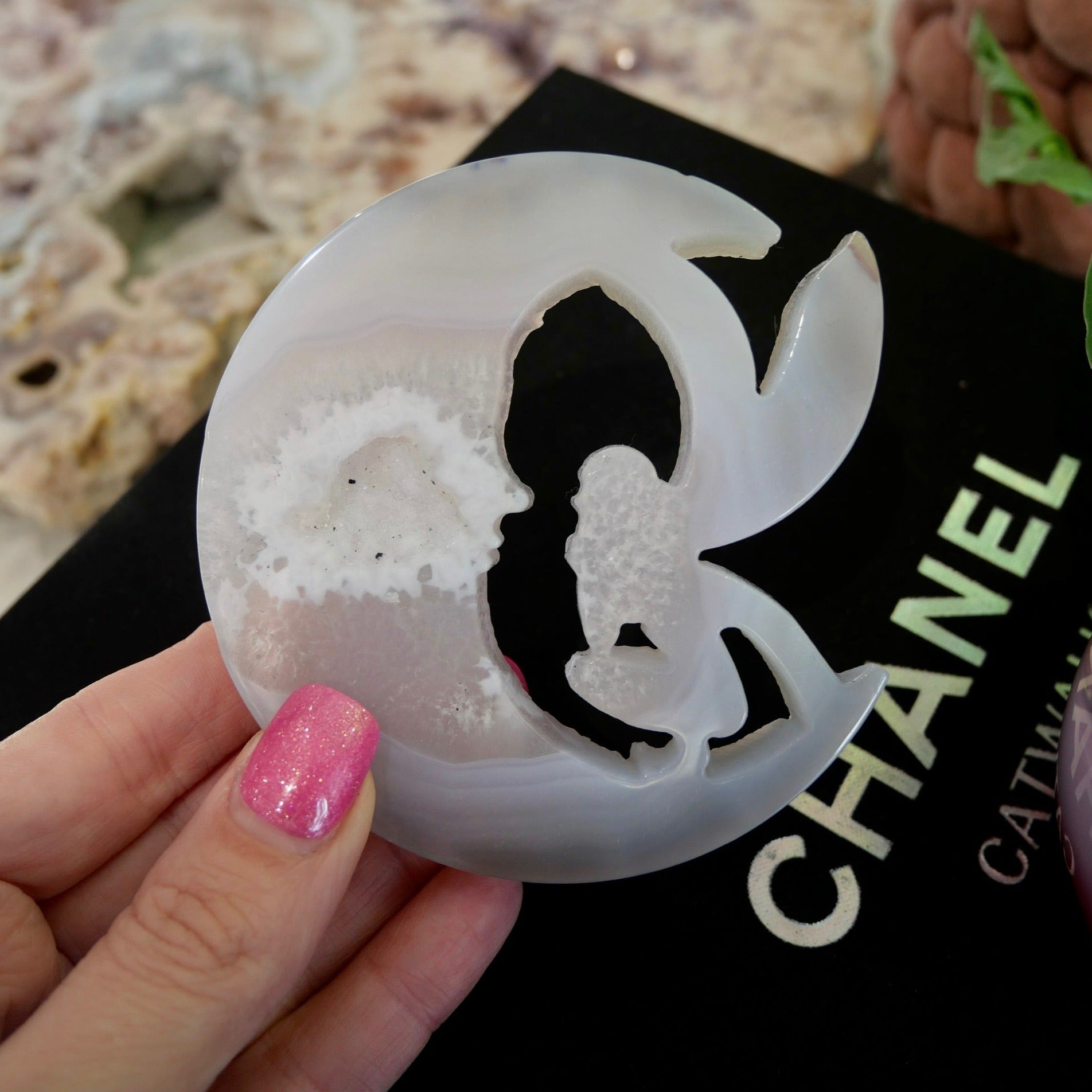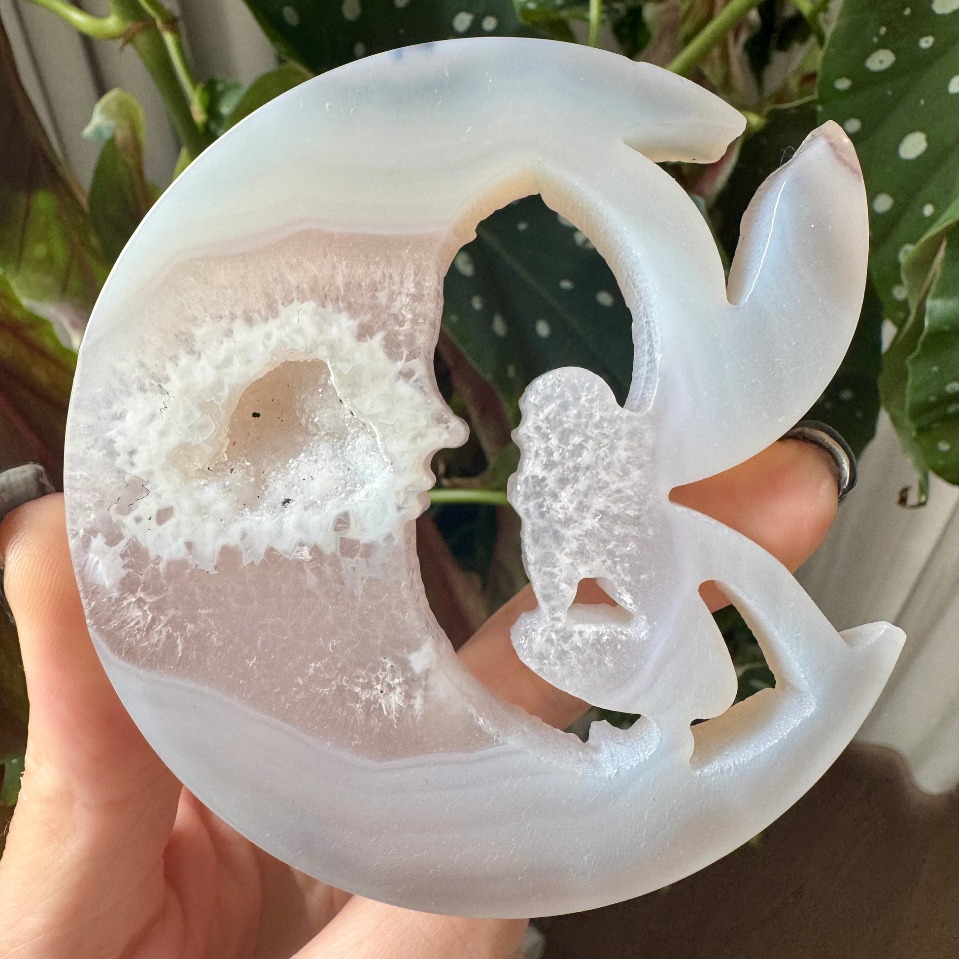 How gorgeous is this Druzy Agate Moon with Fairy carving!!! The sparkle on these babies is amazing. And it is carved to perfection. Gorgeous for girls who love fairies, would be a beautiful addition to a bedside table. All pieces are hand cut and polished, the quality is stunning.
