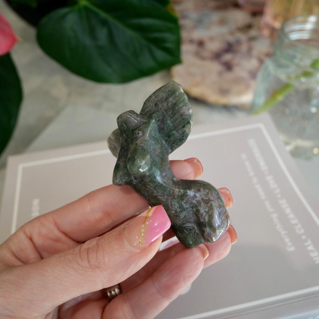 How gorgeous is this Mini Moss Agate Goddess Angel. This special piece although small has the most amazing druzy sugar pockets.