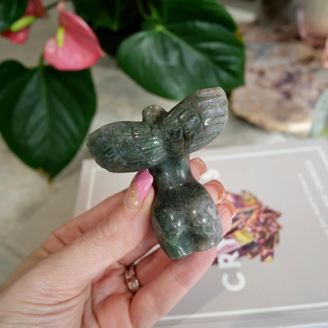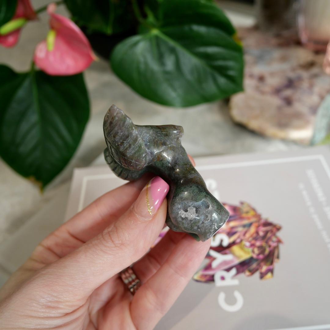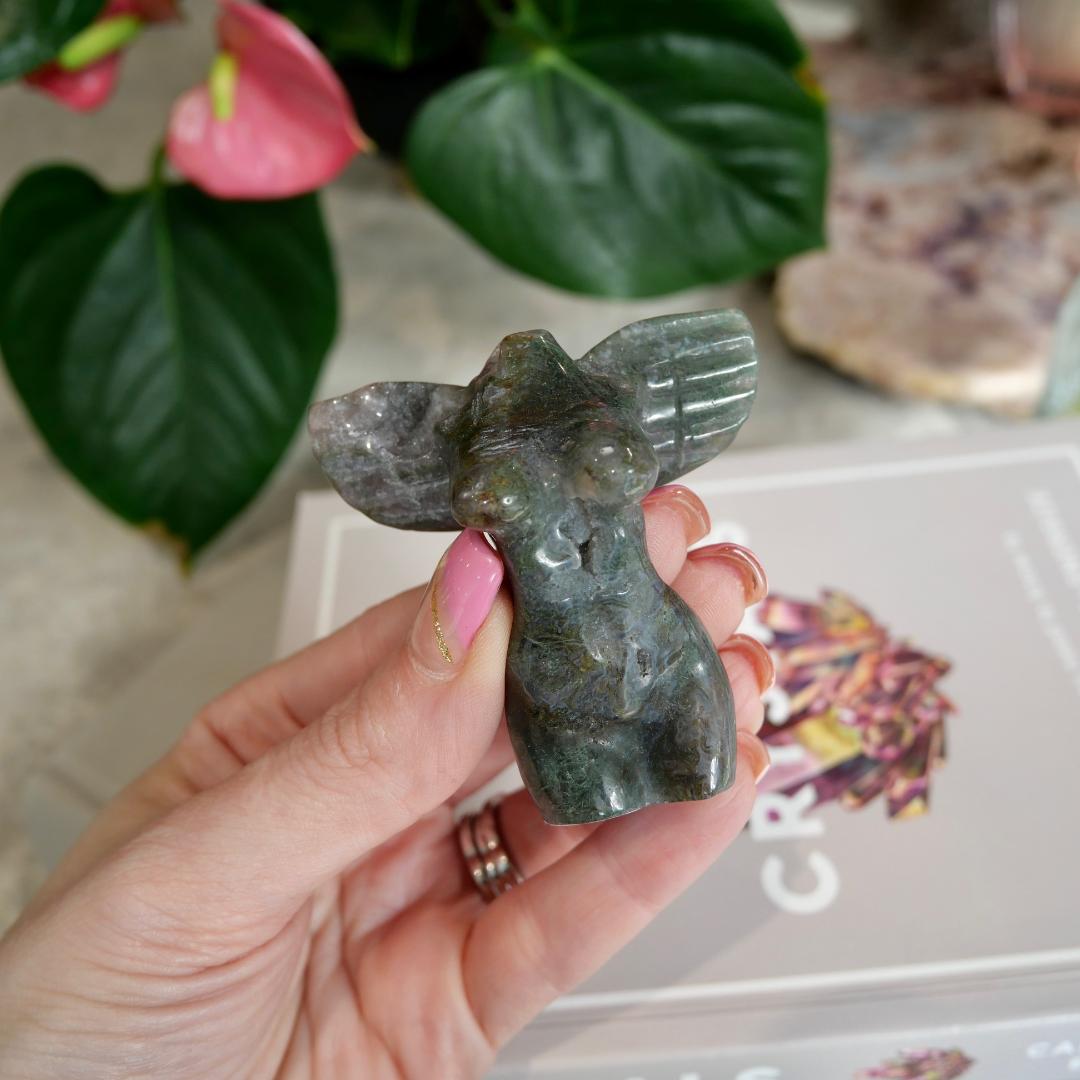 How gorgeous is this Mini Moss Agate Goddess Angel. This special piece although small has the most amazing druzy sugar pockets.