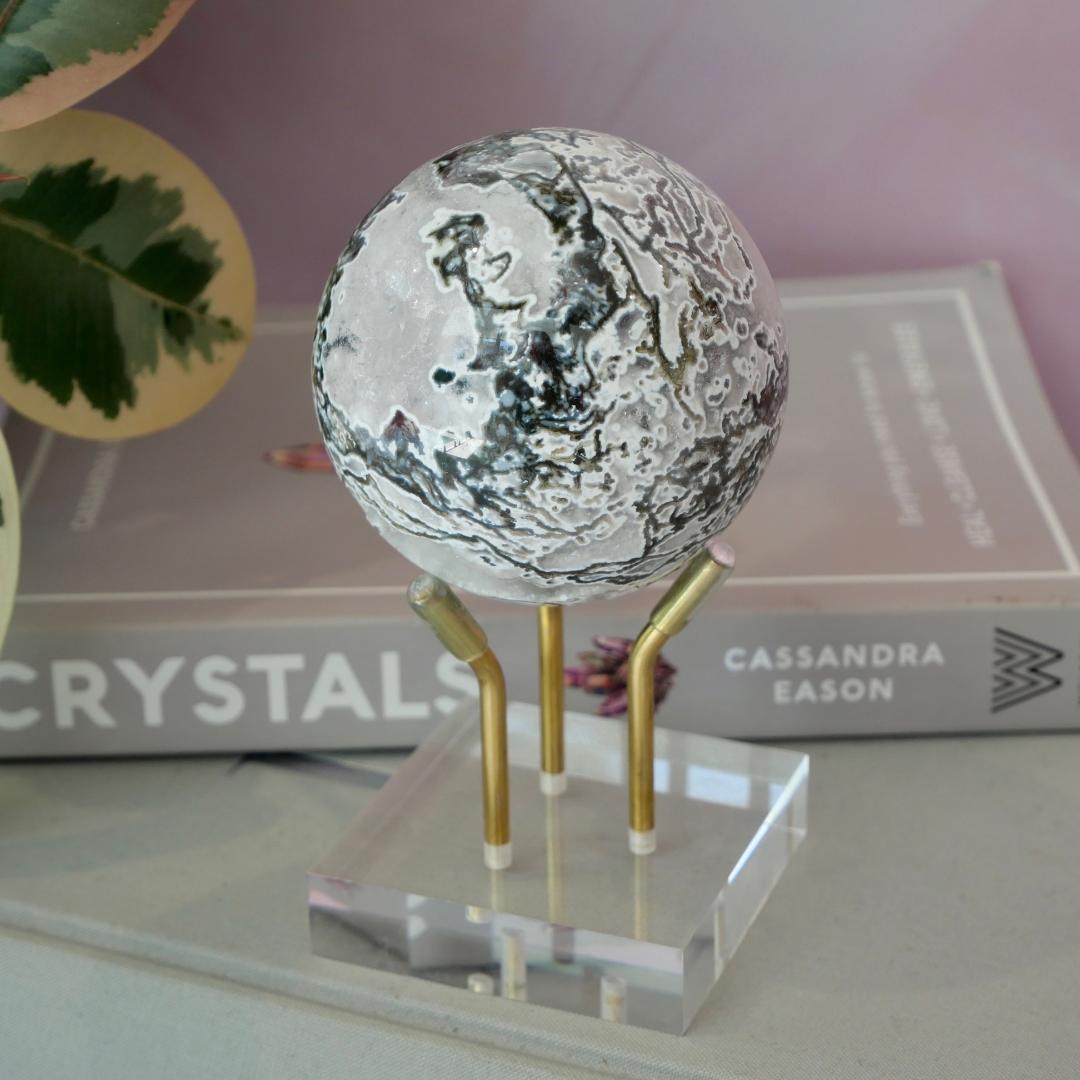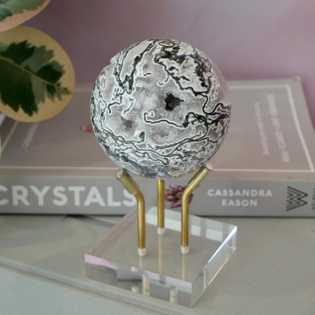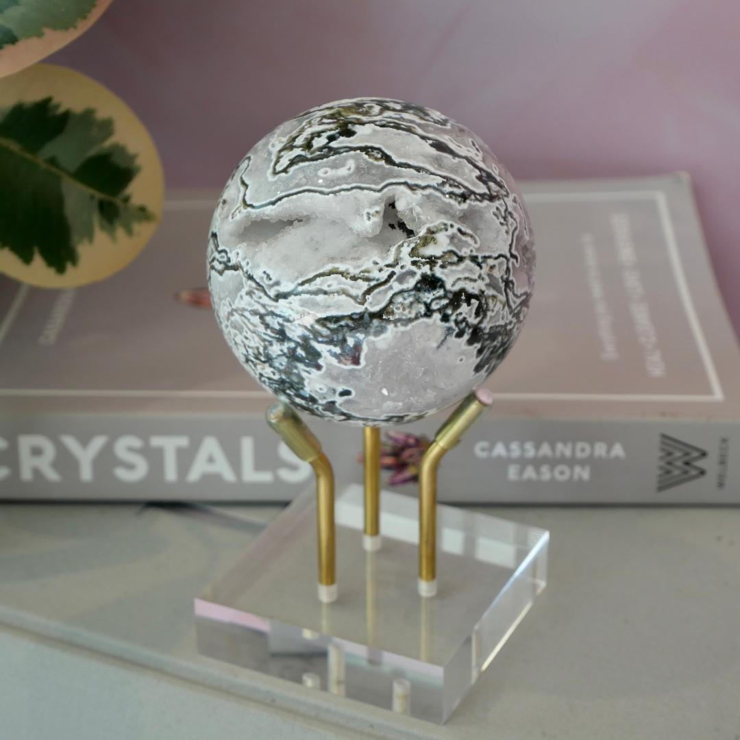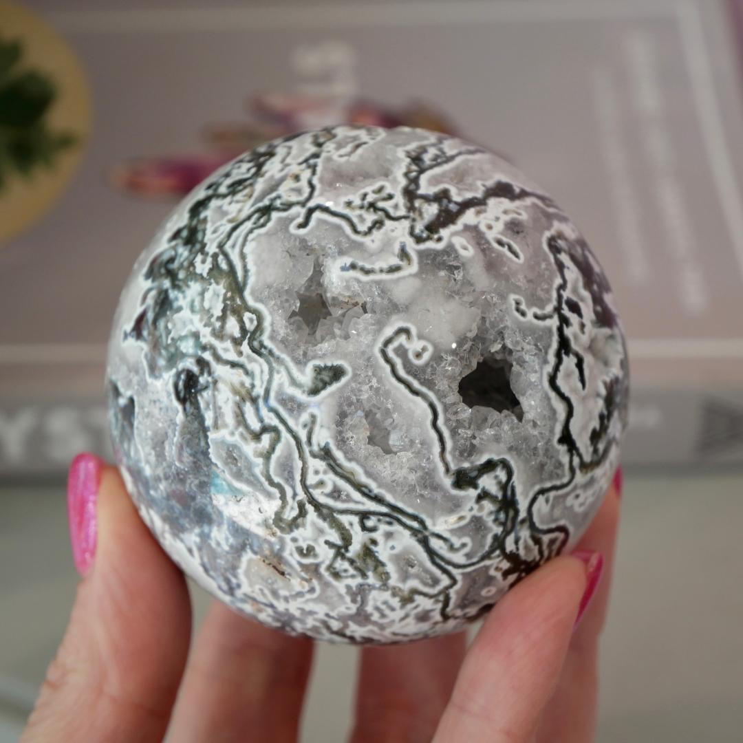 Such a beautiful Moss Agate sphere with the most amazing druzy quartz pockets.