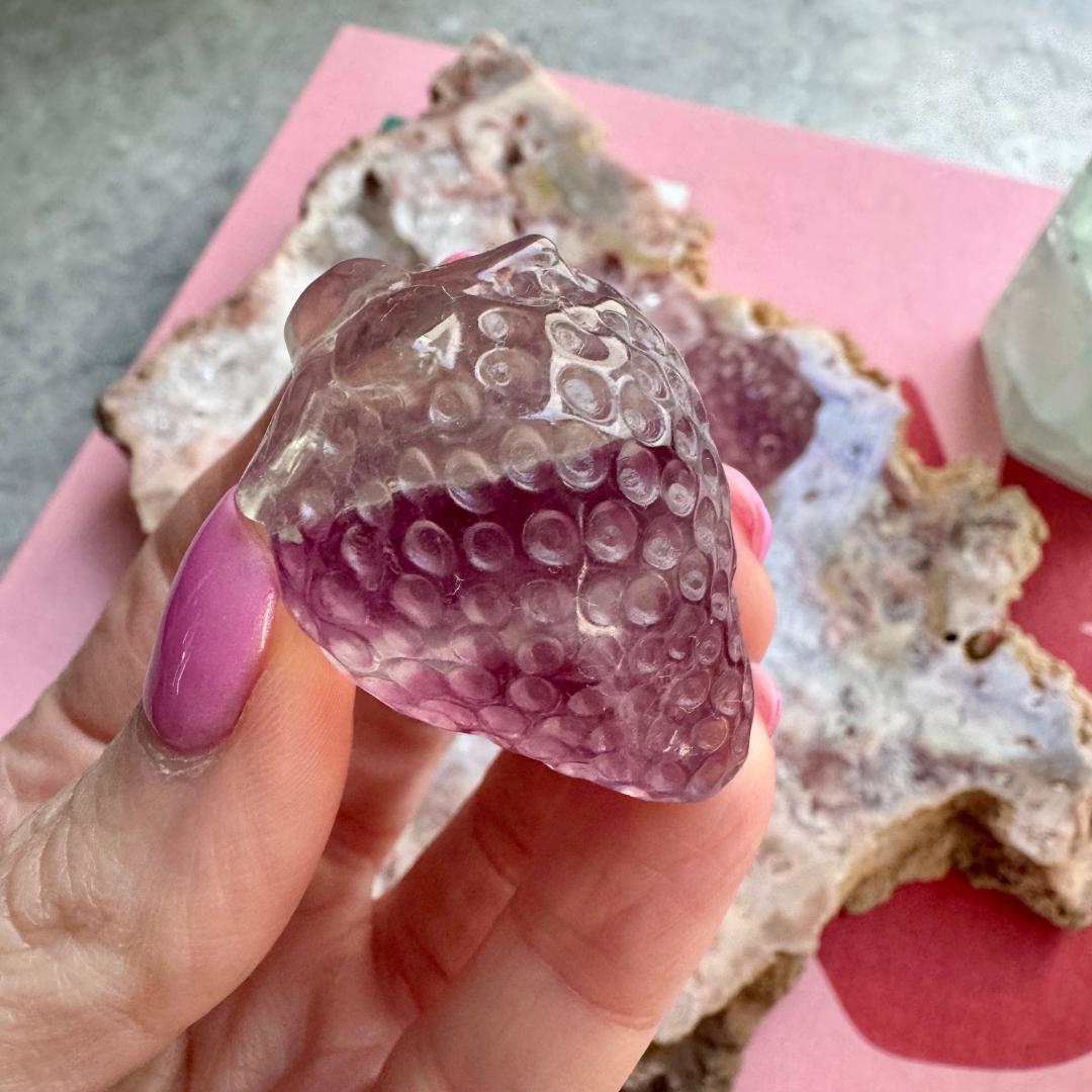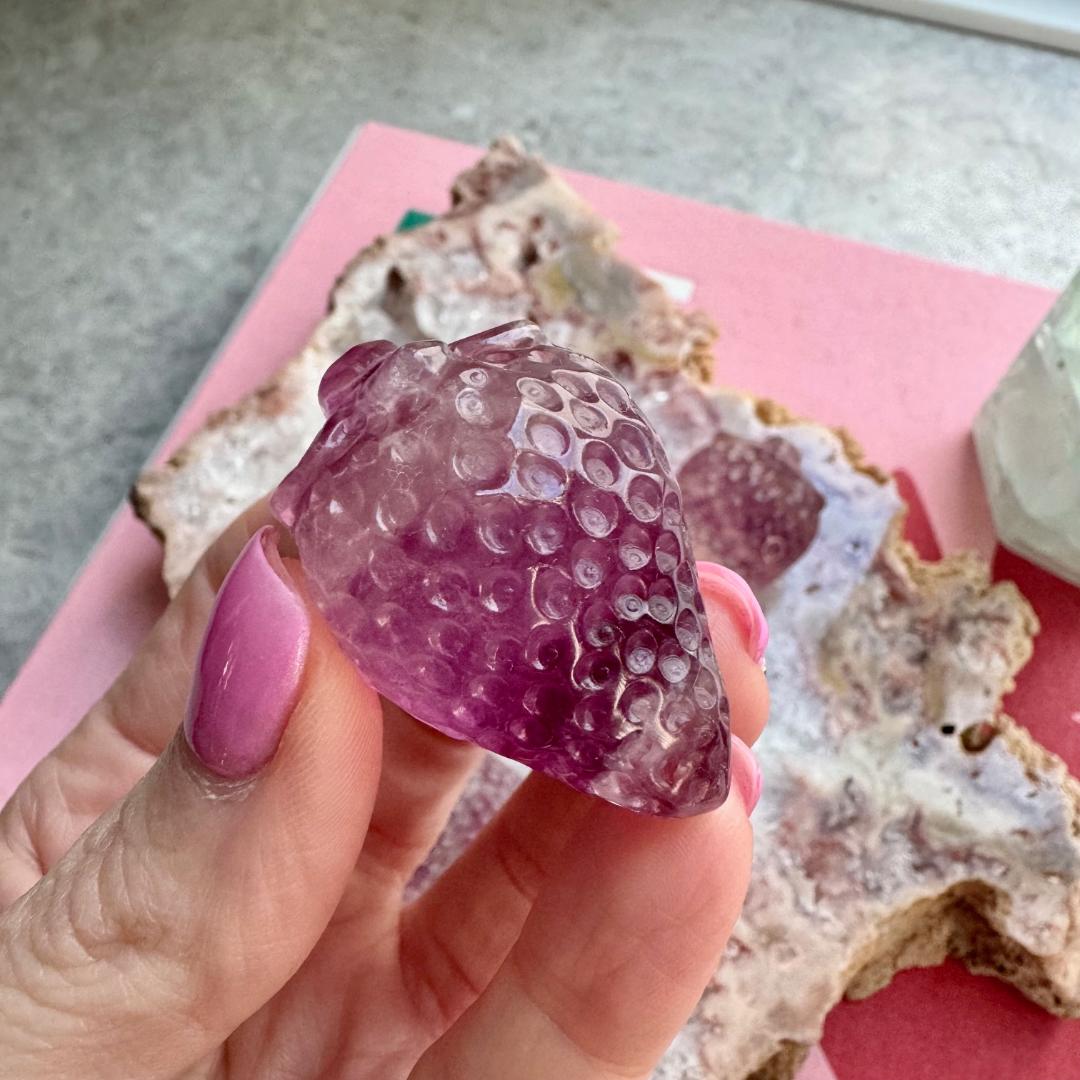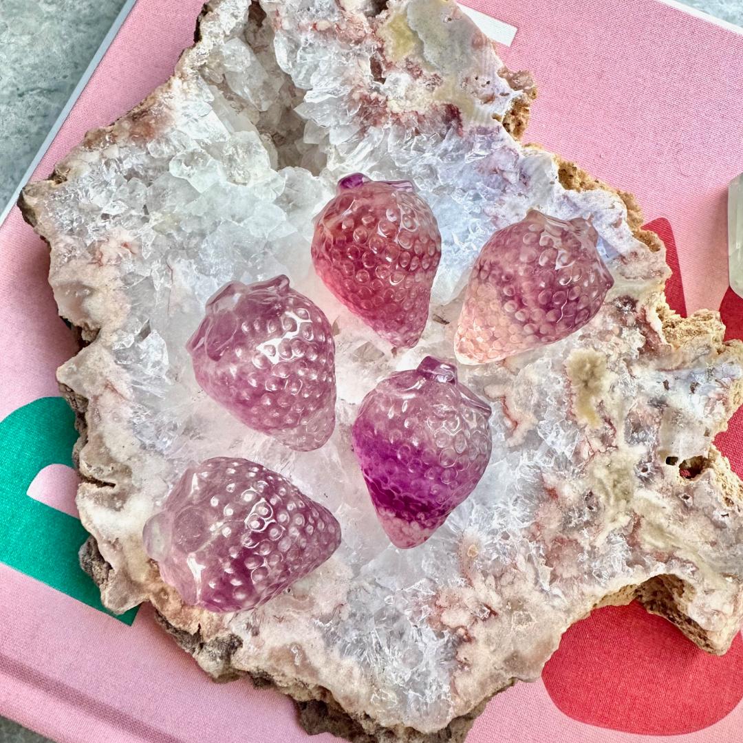 Don't they look good enough to eat....... Not to be eaten, but how cute are these perfectly carved Fluorite Strawberries.