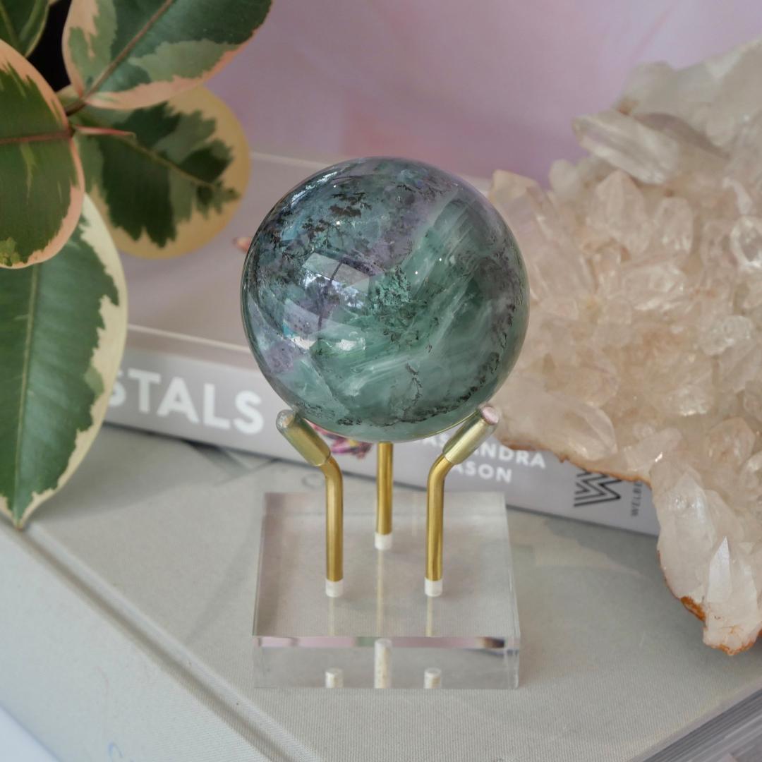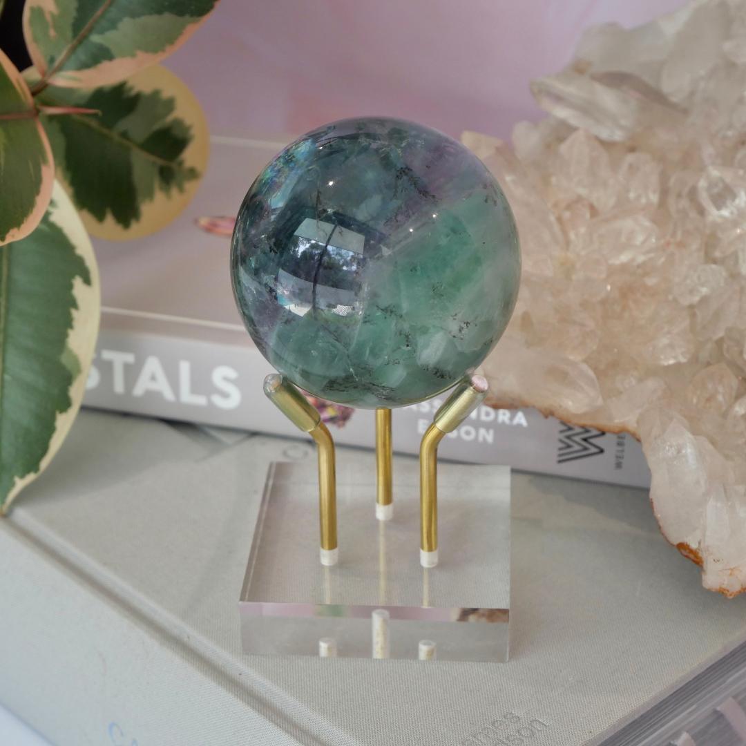 How Stunning is this Rainbow Fluorite Sphere, put this baby near the sunlight and watch the incredible Rainbow banding. Simply Amazing. This one in particular has a Dendrite inclusions, being a multi branching tree like formation within the crystal.