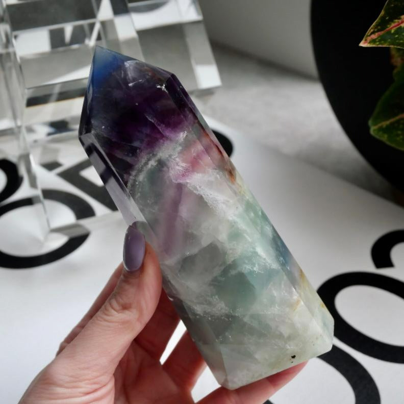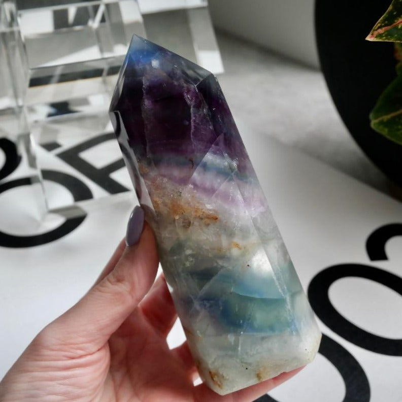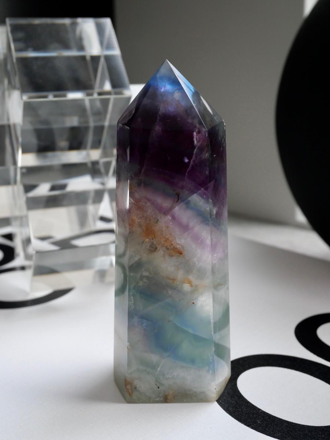 How Stunning is this Rainbow Fluorite Tower, put this baby near the sunlight and watch the incredible Rainbow banding. Simply Amazing. This one has such a beautiful blue fluorite tip, in the sunshine it looks incredible.