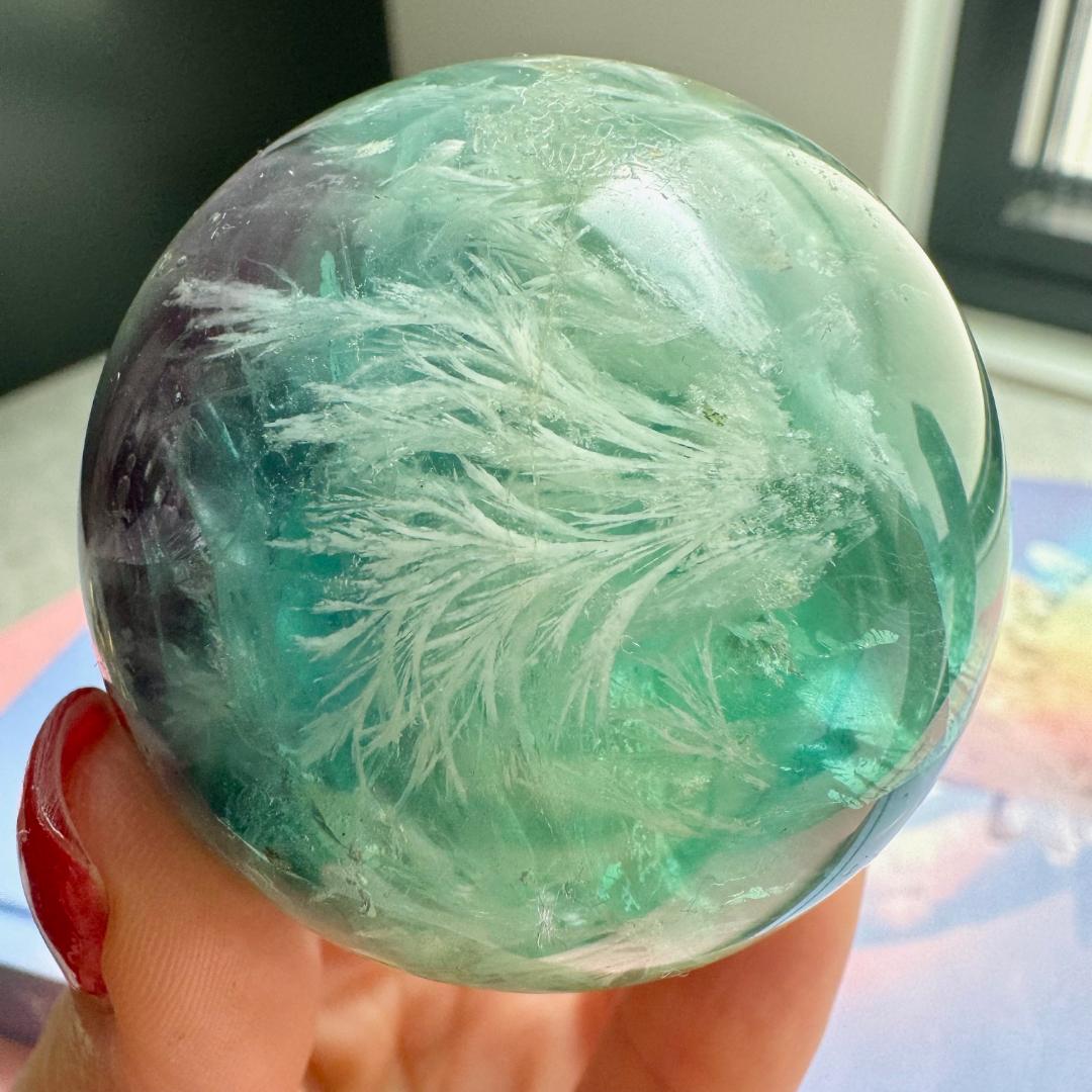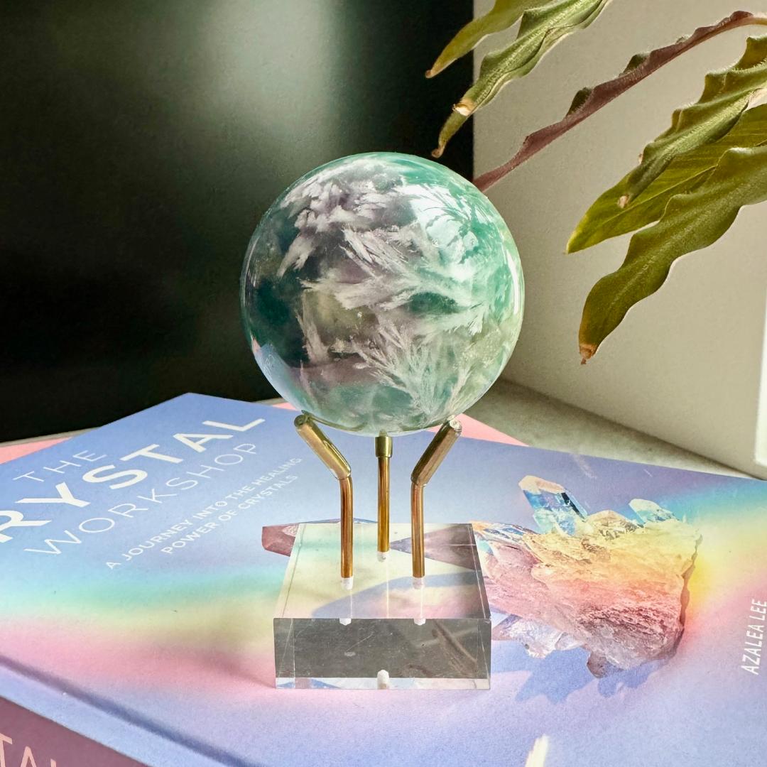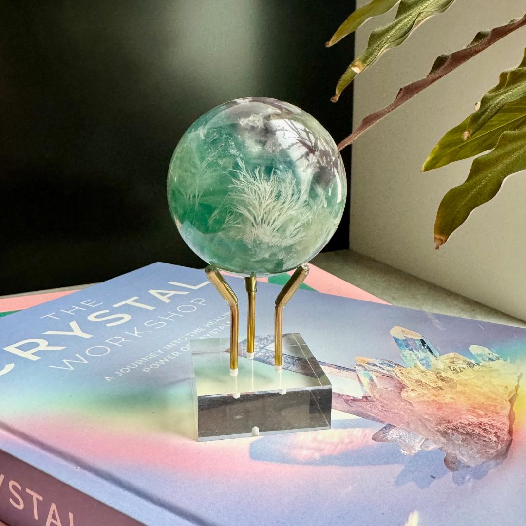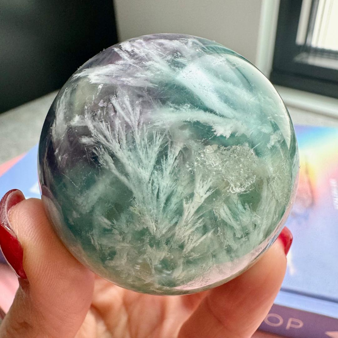 What a stunning Snowflake Fluorite Sphere. It has dendritic inclusions that appear similar to that of a snowflake that appear through the crystal. The addition to the snowflake inclusions is said to assist in spiritual growth and development.
