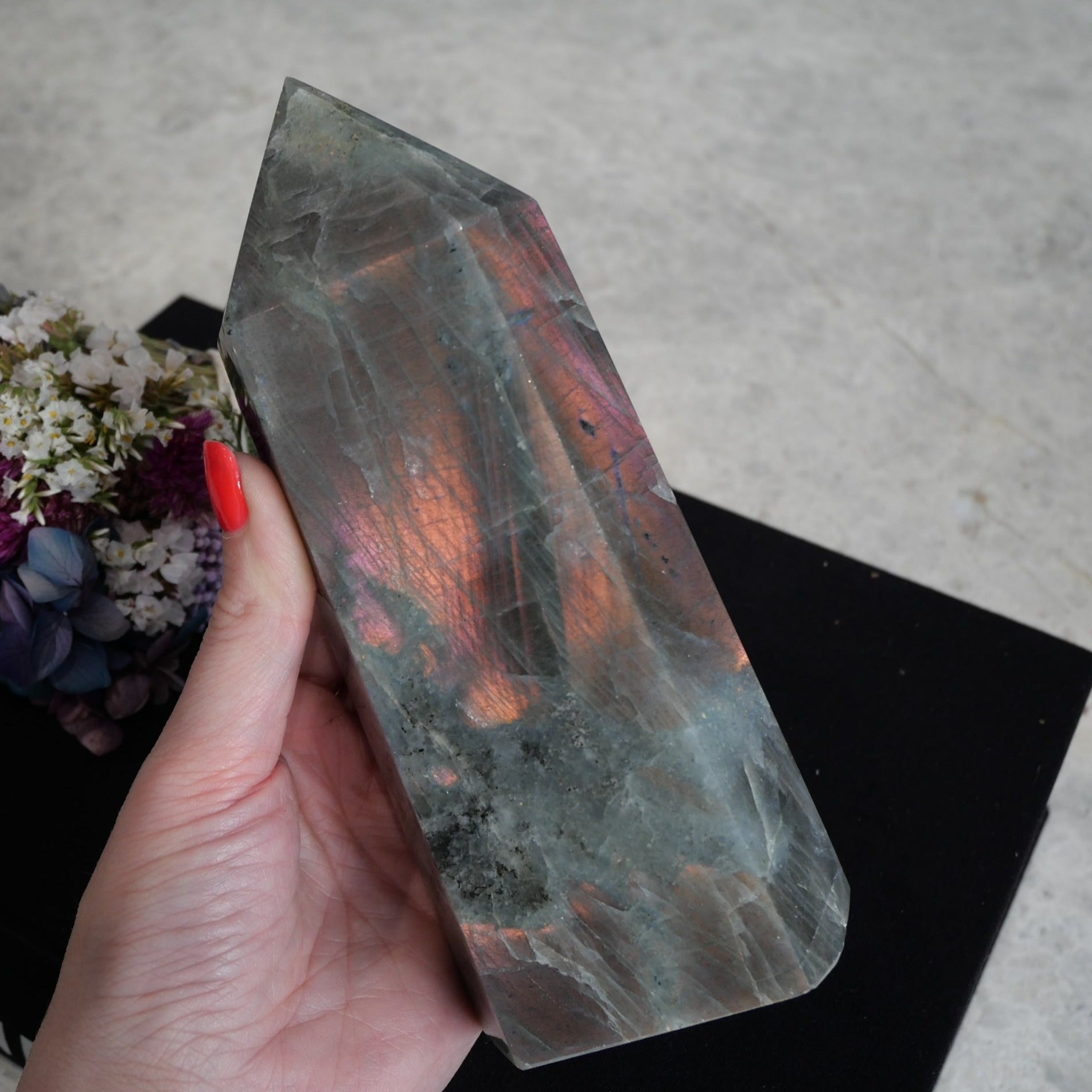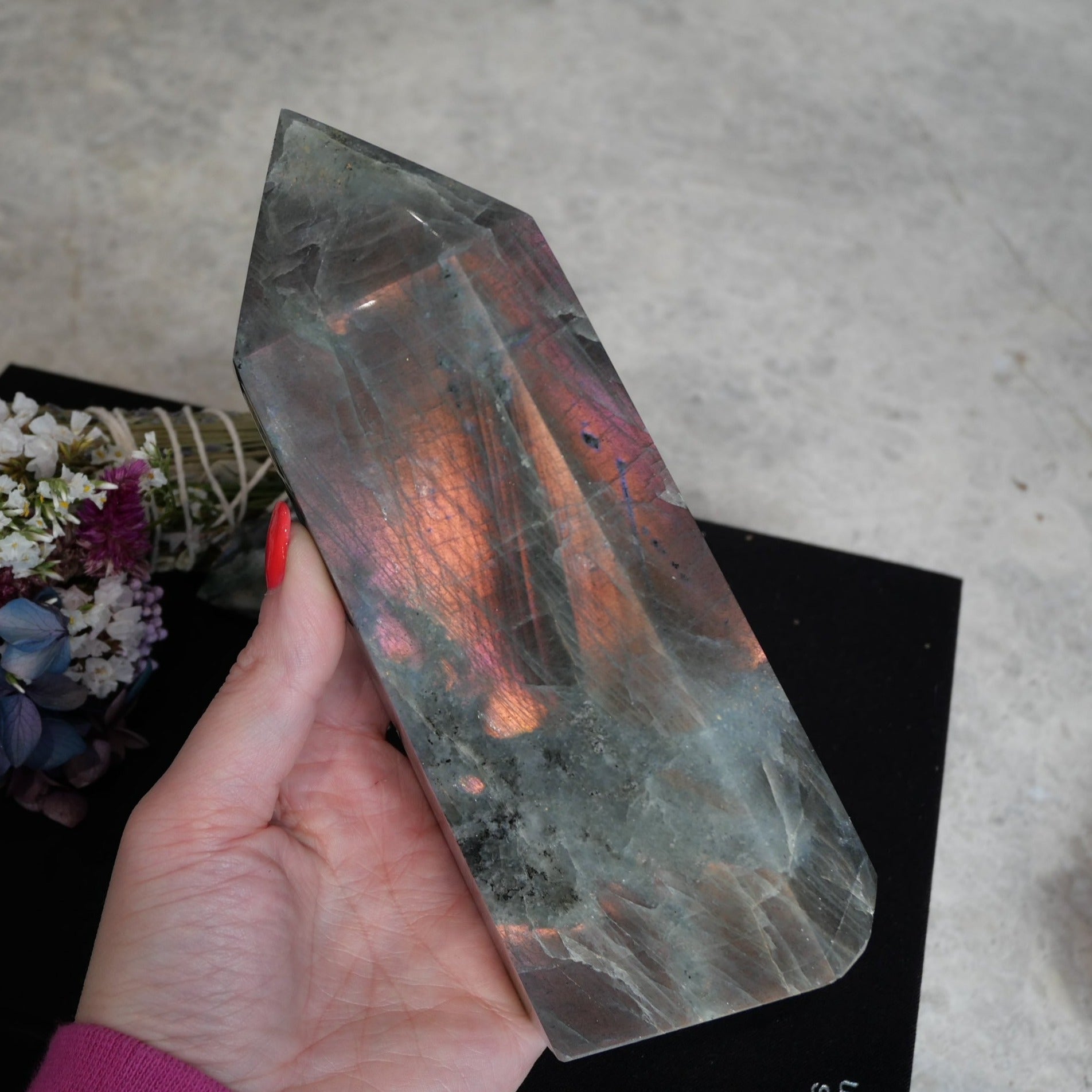 Sunset Labradorite is the rarest Labradorite of them all. With its beautiful hues of purple, pink and orange flash, it makes for a beautiful Sunset. High quality mined labradorite with lots of flash!!